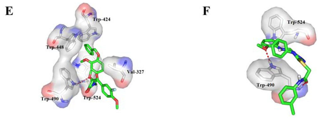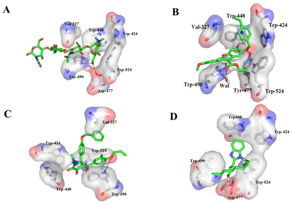 It has been proven that two residues Trp448 and Trp490 were essential for the binding of inhibitor TMG-chitotriomycin of enzyme OfHex1, and the mutation of these two residues would cause a loss of more than 2000-fold activity for this enzyme []. Currently, although the binding mode of OfHex1 with its inhibitors still remained unclear, we hypothesize these two residues might be involved in recognition of inhibitors. Therefore, all the docking conformations of each compound have been checked and only those ligands which interact with these two key residues by π–π interactions or hydrogen-bonding interactions and which also possess high binding scores (Surflex score ≥ 8.5) and low binding energy (bind energy ≤ −8.5 kcal/mol) were kept for further analysis. Consequently, 5 compounds (the first five compounds in Table 1 and Figure 2) from the total 27 compounds with the π–π or hydrogen-bonding interactions with residues Trp448 and Trp490 were obtained. An example of a Surflex-Dock-AutoDock hit (Compound ZINC02083480) with poor docking mode is represented in Figure 2A.