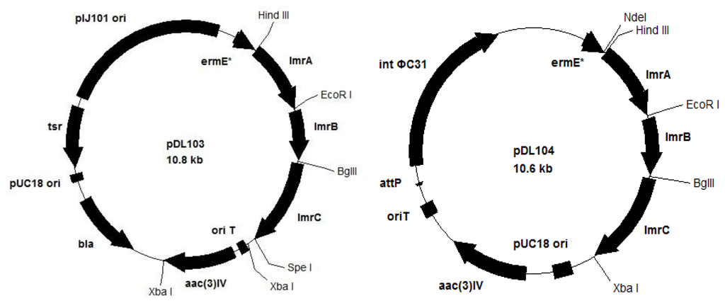 The aac(3)IV and oriT fragment was obtained from pIJ773 after digested with XbaI and ligated to pUWL201, yielding pUWL201apr. Genes of lmrA, lmrB, and lmrC, amplified from PCR, were ligated into pUWL201apr one after another by restriction enzyme digestion and ligation reaction procedure, yielding vector pDL103. Using the similar procedure, lmrA, lmrB, and lmrC were ligated into pIB139, resulting vector pDL104 (Figure 1).