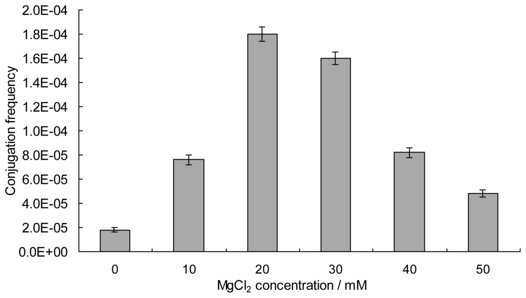 The conjugation medium has a significant influence on the conjugation frequency in streptomycetes [10,18,25–27]. Five applicable solid media, MGM, MS, R2YE [7], ISP Medium 2 (Difco), ISP Medium 4 (Difco), were tested to determine the appropriate medium. Exconjugants were obtained on MS and MGM media, while no exconjugants appeared when using R2YE, ISP2 or ISP4 as the conjugation medium. MS medium, on which the conjugation frequency (7.6 × 10−5) increased 3.2-fold compared to the MGM medium (1.8 × 10−5), proved to be the most appropriate medium for conjugate regeneration. The conjugation MS medium was further optimized with a supplement of 10, 20, 30, 40, 50 mM of MgCl2, respectively. When 20 mM of MgCl2 was added to the MS medium, the conjugation frequency of S. lincolnensis mycelia increased 9-fold compared without MgCl2 (Figure 3). However, the conjugation frequency decreased significantly as the concentration of MgCl2 increased, considering the spore formation and mycelia growth were severely inhibited at concentrations of 40 mM or higher for S. pristinaespiralis [28]. Thus, MS medium supplemented with 20 mM of MgCl2 proved to be optimal for the conjugation of E. coli-S. lincolnensis mycelia.