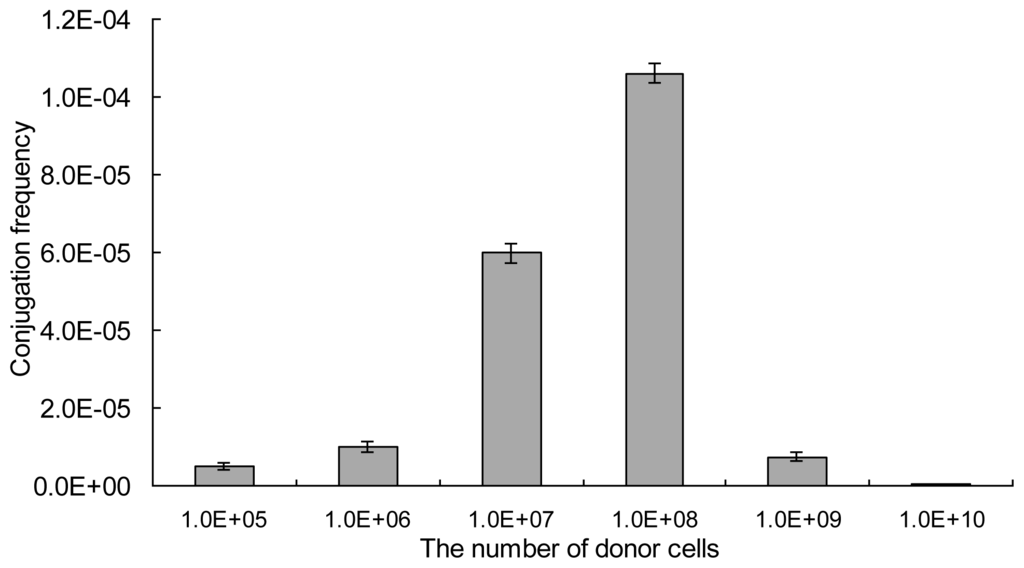 The ratio of donor cell numbers and recipient mycelia was a crucial parameter in the intergeneric conjugation of streptomycetes [29]. A stationary volume of 0.5 mL of mycelia suspension on third day and a range of E. coli donor cells (105–1010) were tested. As shown in Figure 4, few exconjugants were obtained when the number of donor cells was less than 106. The conjugation frequency significantly increased with increasing number of donor cells. When the number of the donor cells was up to 108, the conjugation frequency reached the highest frequency of 1.1 × 10−4. And this indicated that 108 of donor cells were optimal for the intergeneric conjugation from E. coli to S. lincolnensis mycelia. Similar results had been observed in the study of actinomycete Kitasatosporasetae, where a certain number of donor cells was required to achieve the highest frequency [25].