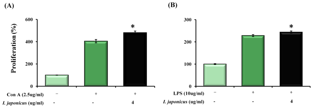 In summary, we found that I. japonicus is critically involved in the T and B lymphocyte proliferation related to cell mediated and humoral immunity. The results were that the I. japonicus extract stimulated T, B lymphocytes and increased NK cell activity. Furthermore, the cytokines, the most important of the immunomodulation factors on immune cell stimulation, enhanced cell activity more than control groups. The IFNγ and TNFα helped to activate the T, B lymphocyte. Furthermore, more NK cells were produced than in control groups. These findings suggest that I. japonicus could inhibit cancer cell growth as well as generate humoral and cell mediated immune response and host defense through the activation of immune cell function. Thus, our results suggest that providing new research into the mmunomodulation effect of wild edible vegetable as japonicus extract as functional food materials has potential.