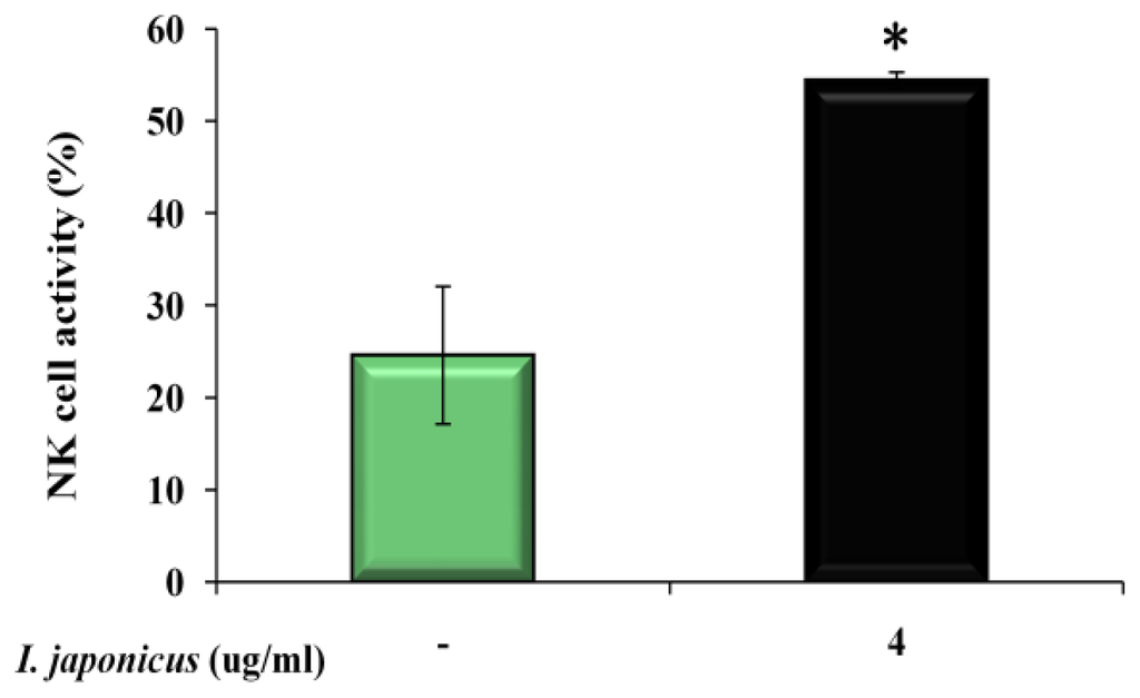 Since NK cells are known to be important effectors in suppressing tumor growth [14,15], we considered the activity of I. japonicus in enhancing NK activity and its relation to antitumor activity. We evaluated NK cell activity and the cytotoxic effect on target cells by co-culture with YAC-I as NK-sensitive cells. As shown in Figure 2, NK cells treated with I. japonicus represented over 30% cytotoxic activity compared to the control against YAC-I tumor cells at effectors with a target ratio of 10:1. Therefore, we suggest that, considering these results, increased NK cell activity could inhibit cancer cell growth as well as strengthen immune response and host defense.
