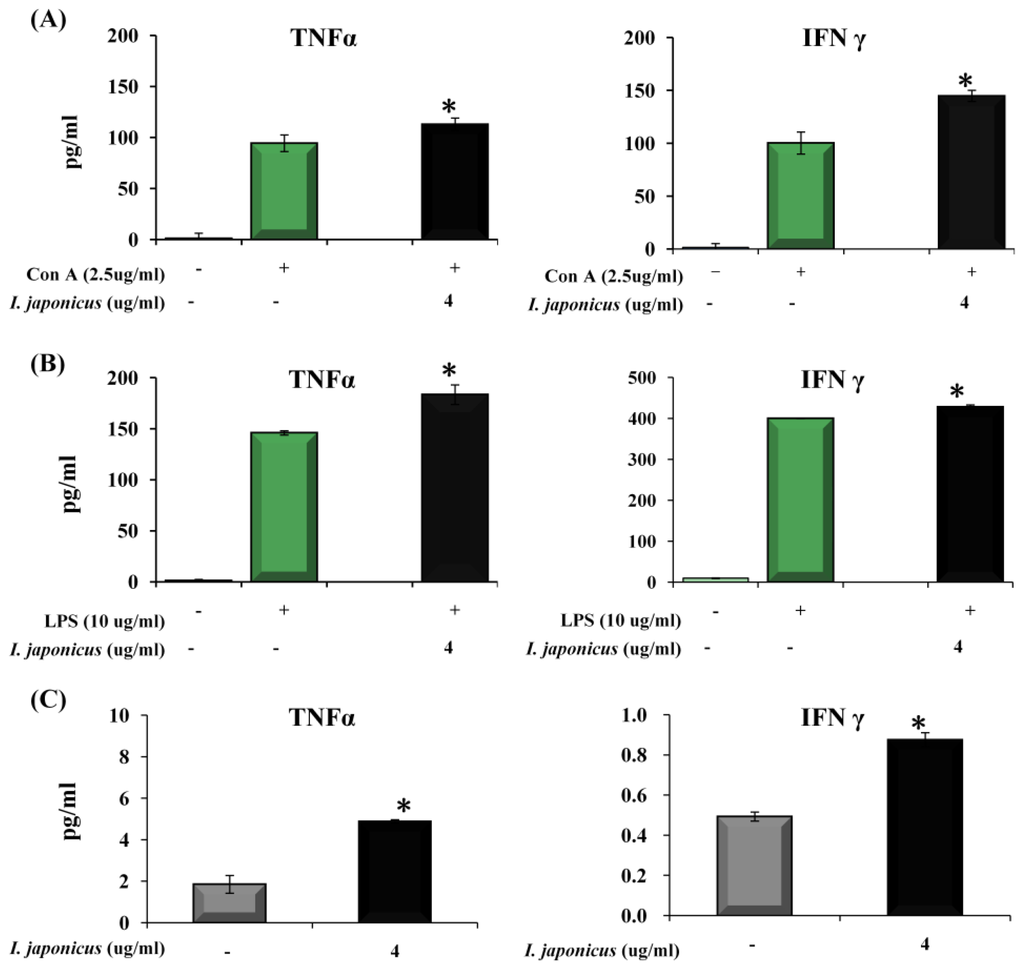 The effect of I. japonicus extract on the levels of immune-modulating cytokines as TNFα and IFNγ was analyzed (Figure 3A). The TNFα and IFNγ levels of T lymphocyte treated with I. japonicus extract increased by 18.4 and 44.4 pg/mL compared to that of the control (p < 0.05). Cytokine levels of B lymphocyte, TNFα and IFNγ were 37.3 and 27.8 pg/mL compared to the control, which was treated with mitogen (LPS) alone (Figure 3B). Furthermore, NK cells produced a very small amount of TNFα and IFNγ in comparison to lymphocytes. However, levels of TNFα and IFNγ increased by about 2 fold compared to the control (p < 0.05).
