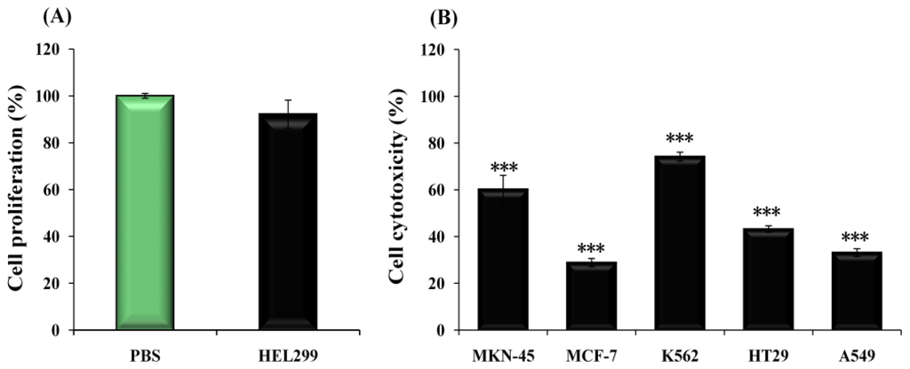 HEL299 (KCLB NO.10137), A549 (KCLB NO.10185), HT29 (KCLB NO.30038), K562 (KCLB NO.10243), MCF-7 (KCLB NO.30022), MKN-45 (KCLB NO.80103) and YAC-I (KCLB NO.40160) cell lines were purchased from the Korean Cell Line Bank (Seoul, Korea). The cell lines were grown in RPMI 1640 medium or DMEM with 10% FBS and 1% penicillin–streptomycin, and incubated at 37 °C in 5% CO2.