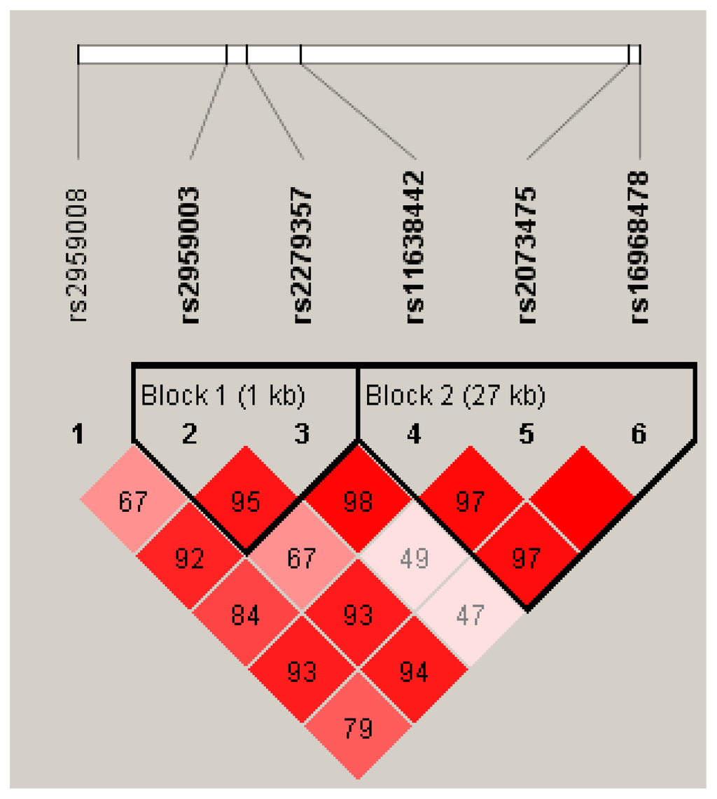Linkage disequilibrium (LD) pattern among six SNPs by Haploview analysis. Numbers inside the boxes represent D′ values for LD, and the miss number is 100.