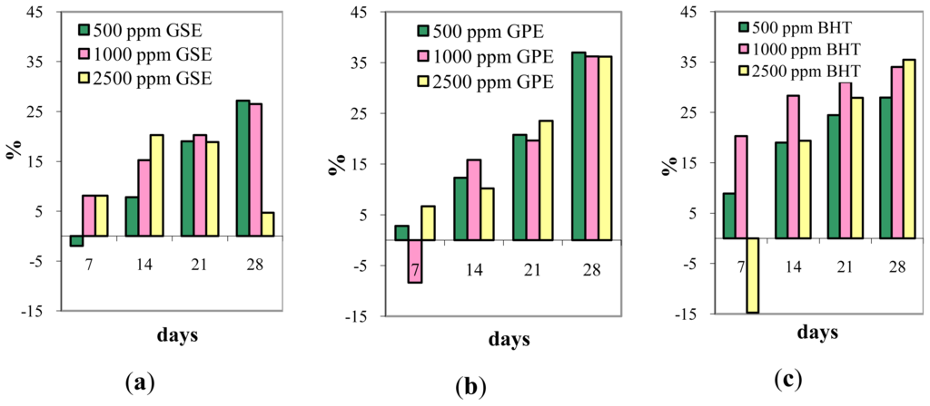 | 2500 ppm BHT | 12.93±0.17 | 15.09 ± 0.43 * | 10.74 ± 0.45 ** | 9.86 ± 0.48 ** | 9.12 ± 0.33 *** |
