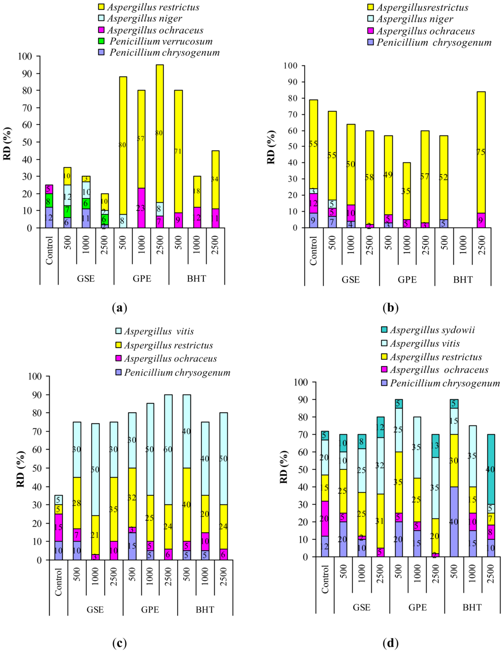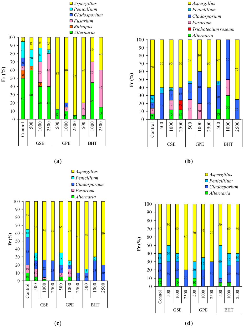 2.3. Impact of Grape Extracts and BHT Treatment on Natural Mycoflora