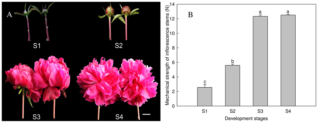 Inflorescence stems of four development stages were used as materials to study impact factors of the mechanical strength of P. lactiflora (Figure 1A). Determination using 3-point bending-tests showed that their mechanical strength increased from S1 to S4, and S4 was 4.8 times higher than S1, but the difference between S3 and S4 was not significant (Figure 1B).