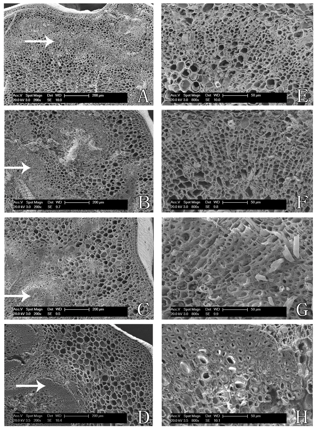 Observation of inflorescence stem microstructure with scanning electron microscope. (A–D) Photographs of development inflorescence stem with a magnification of 200 times; (E–H) Photographs of partial enlargement in A–D marked by the arrow.