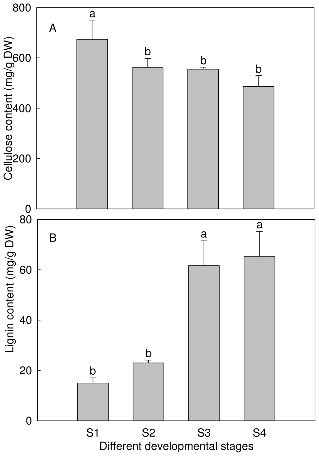 As the major components of plant cell wall that play a role in mechanical support, cellulose and lignin contents were determined in these inflorescence stems. As shown in Figure 3, cellulose content had been declining from S1 to S4, but the difference between the last three stages was not significant. Its correlation coefficient with mechanical strength was −0.85. In contrast, lignin content increased gradually with the development of inflorescence stem, and S4 was 4.3 times as high as S1. This trend was the same as mechanical strength. Meanwhile, a highly significant positive correlation between them (R = 0.99 **) was observed.
