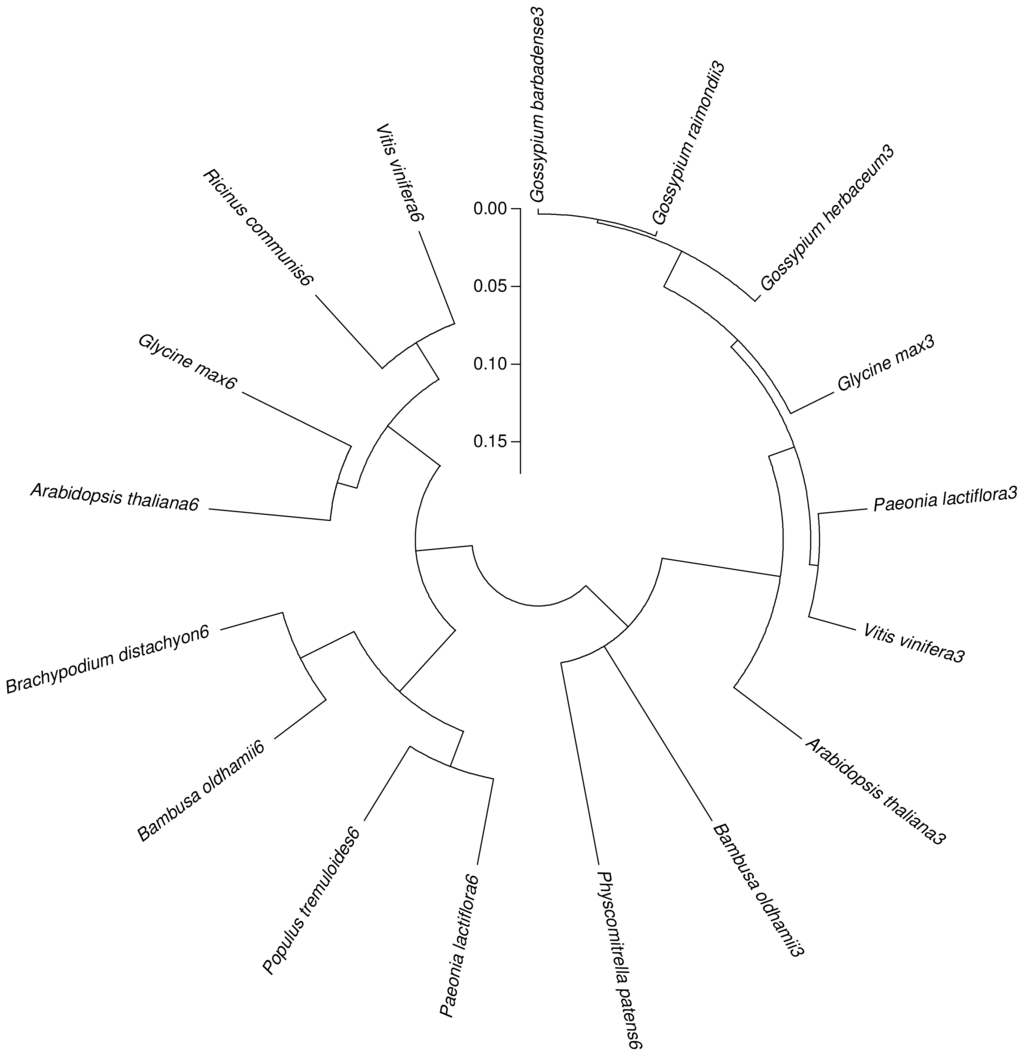 Phylogenetic tree of PlCesA3, PlCesA6 and CesA from some other plants. The amino acid sequences were obtained from GenBank: Arabidopsis thaliana3 (NP_196136); Bambusa oldhamii3 (AAY43225); Glycine max3 (XP_003533898); Gossypium barbadense3 (ADZ16119); Gossypium herbaceum3 (ADZ16120); Gossypium raimondii3 (ADZ16121); Vitis vinifera3 (XP_002278997); Arabidopsis thaliana6 (NP_201279); Bambusa oldhamii6 (AAY43223); Brachypodium distachyon6 (XP_003557327); Glycine max6 (XP_003525098); Physcomitrella patens6 (ABI78959); Ricinus communis6 (XP_002524299); Vitis vinifera6 (XP_002265955).