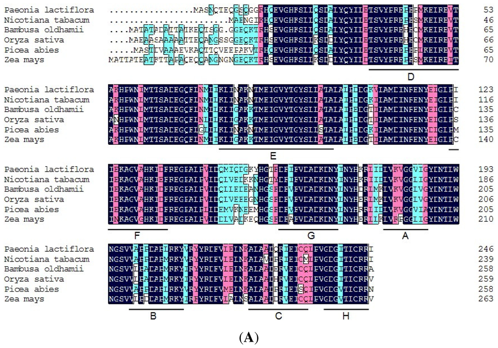 Sequence alignment and phylogenetic tree of CCoAOMT from Paeonia lactiflora other plants. (A) Sequence alignment; (B) Phylogenetic tree. The amino acid sequences were obtained from GenBank: Bambusa oldhamii (EF028662); Nicotiana tabacum (AF022775); Oryza sativa (AY644636); Picea abies (AM262870); Zea mays (AJ242981). Color indicates homology level, black = 100%, pink ≥75%, blue ≥50%. A, B and C are popular conserved sequence elements in plant methyltransferase; D, E, F, G and H are signature sequences of CCoAOMT.
