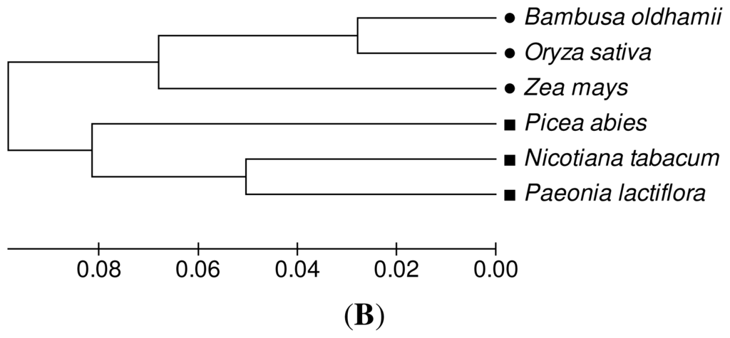 CesA1 and CesA2 encoded 1087 and 1081 amino acids, respectively, which were 68% identical. Multiple alignment analysis indicated that CesA1 and CesA2 had a high homology to CesA from other plants, such as 88% and 67% identity with Betula luminifera CesA (ACJ38667), 85% and 67% identity with Populus ussuriensis CesA (ADV58936), 79% and 66% identity with Hordeum vulgare CesA (AAR29964), respectively. The phylogenetic tree that was constructed using the neighbor-joining method revealed CesA in these plants was divided into two categories, CesA1 and CesA2 in P. lactiflora belonged to CesA3 and CesA6, respectively (Figure 4). Therefore, these two genes were designated as PlCesA3 and PlCesA6 with accession number JQ728998 and JQ728999, respectively. For CCoAOMT in P. lactiflora, a blast analysis showed that this protein shared 90–94% identity and 95–98% similarity with CCoAOMT from Vitis vinifera (XP_002282867), Populus tremuloides (AAA80651), Broussonetia papyrifera (AAT37172), Populus trichocarpa (ACC63876), Codonopsis lanceolata (BAE48788) and Solanum tuberosum (BAC23054). Amino acid sequence alignment of CCoAOMT in Paeonia lactiflora and Bambusa oldhamii, Nicotiana tabacum, Oryza sativa, Picea abies and Zea mays was performed, the result showed PlCCoAOMT had conserved sequence elements of the CCoAOMT gene, namely A, B, C, D, E, F, G and H (Figure 5A). Among them, A, B and C were commonly found in the plant methyltransferase gene, and D, E, F, G and H were unique in the CCoAOMT gene. Meanwhile, their phylogenetic tree displayed CCoAOMT in these plants was divided into two categories. Dicot and monocotyledons, and Nicotiana tabacum was the one most similar to P. lactiflora (Figure 5B). This coincides with the traditional plant taxonomy. Additionally, this sequence had been submitted to GenBank with the accession numbers JQ684014.