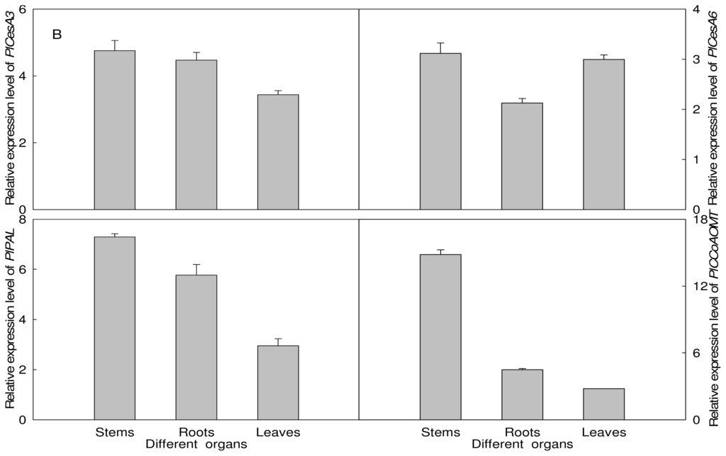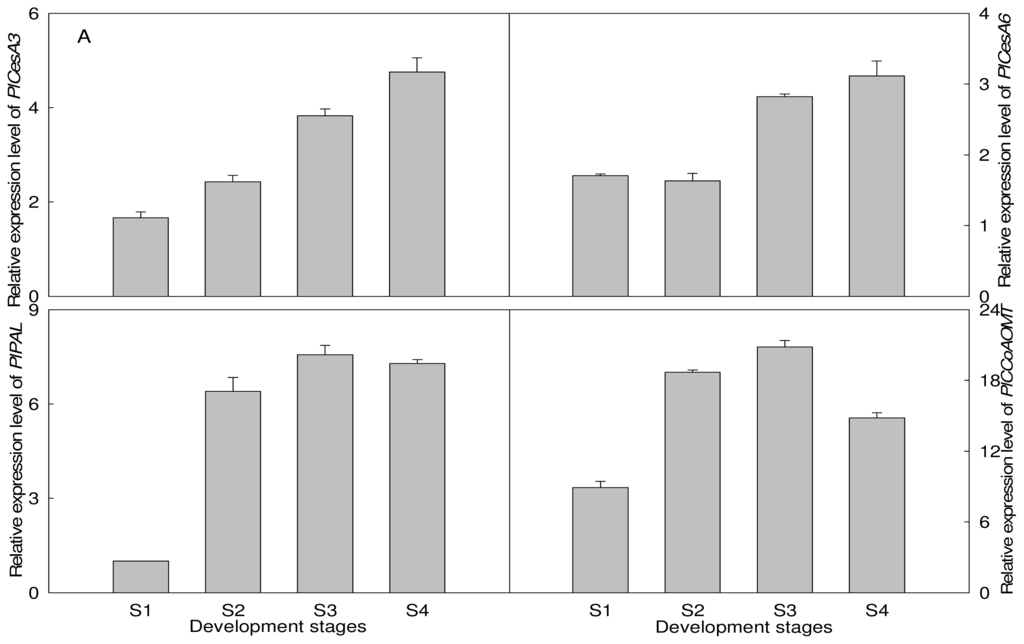 To examine whether cellulose and lignin contents in different developmental inflorescence stems could be related to the expression of related biosynthetic genes, transcript levels of three genes isolated in this paper, PlCesA3, PlCesA6 and PlCCoAOMT, together with PlPAL (JQ070801) we had isolated from P. lactiflora, were analyzed by real-time quantitative polymerase chain reaction (Q-PCR). This is a highly sensitive, accurate, rapid and high-throughput technique [25]. We found that the expressions of these genes could be detected in all tissues, but the expression levels were different (Figure 6). During the developmental stages of inflorescence stems, the transcript levels of PlCesA3 and PlCesA6 almost showed an upward trend, but the expression levels of PlPSY and PlCCoAOMT trended similarly which increased from S1 to S3, and with a little decrease in S4. In different organs, transcript levels of PlCesA3 and PlCesA6 were different, and their minimum consisted in leaves and roots, respectively. For PlPSY and PlCCoAOMT, the expression patterns were identical, their highest levels of transcription occurred in stems which were 156.76% and 433.25% more than those of leaves, respectively.
