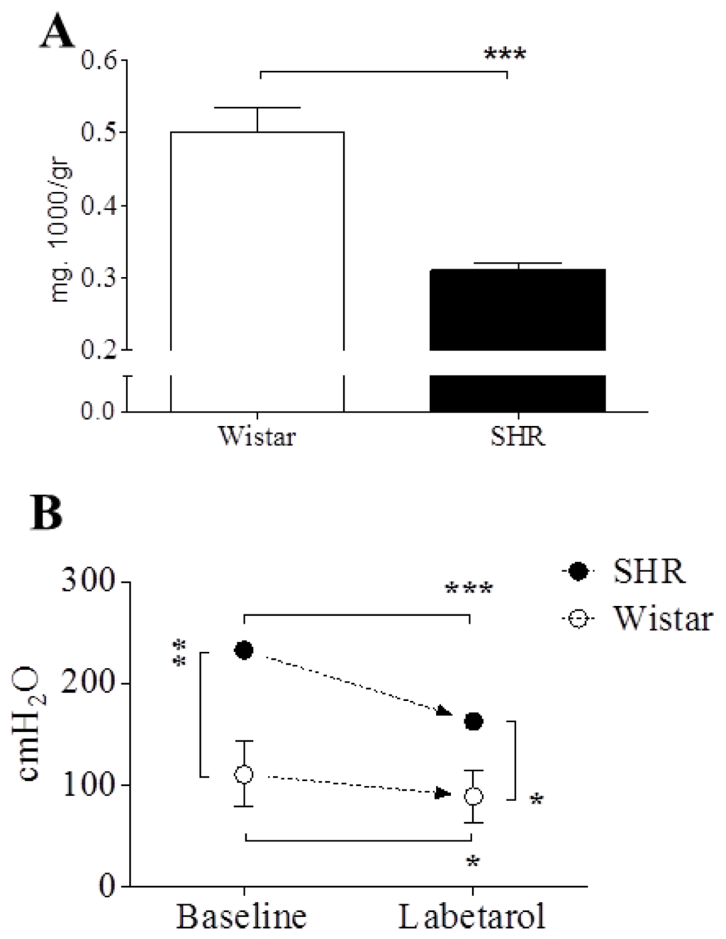 The mean arterial pressure (time-averaged arterial pressure over 10 min) was significantly different between Wistar rats (111.0 ± 32.0 SE cm H2O) and SHRs (233.0 ± 4.7 SE cm H2O) (p < 0.01). After the injection of labetalol, mean arterial pressures decreased to 89.4 ± 25.6 SE cm H2O (p < 0.001) in Wistar rats and 163.1 ± 4.7 SE cm H2O (p < 0.05) in SHRs, respectively. Even after labetalol injection, mean arterial pressure differed significantly between the groups (p < 0.05) (Figure 1B).