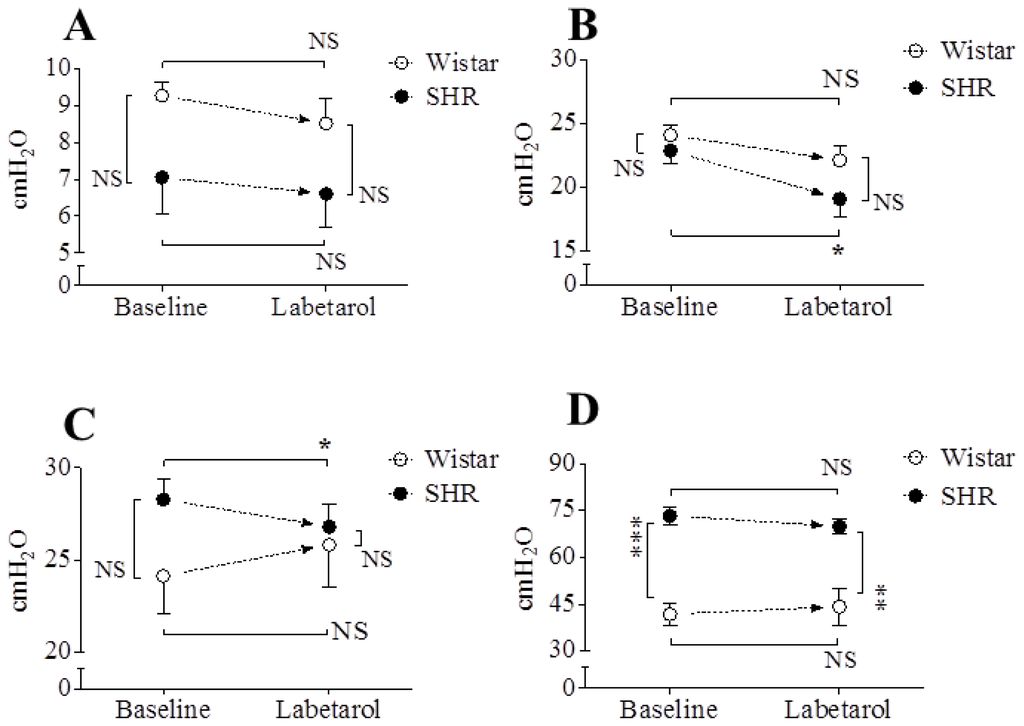 The effects of intraarterial 5 mg·kg−1 labetalol on the pressure parameters in SHRs and Wistar rats. (A) Basal pressure by detrusor pressure (DP); (B) Flow pressure; (C) Threshold pressure by DP; (D) Micturition pressure by DP. Results are expressed as mean ± standard error of the mean. * p < 0.05, ** p < 0.01 (unpaired Student’s t-test). NS: not significant.