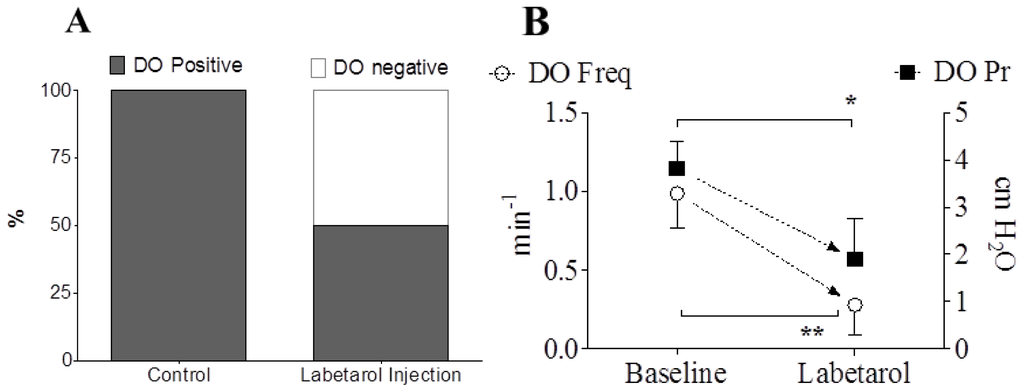 Thus, the present study was undertaken to compare bladder function and some characteristics of DO during the filling phase before and after the administration of the nonselective sympathetic blocking agent labetalol. For this purpose, the intraabdominal and intravesical pressures were measured simultaneously in spontaneously hypertensive rats (SHRs), which are a model system for studying DO and altered sympathetic activity. The study also aimed to test the hypothesis that the dual-control systems of the ANS are closely related and that upregulated sympathetic activity is required to maintain the parasympathetic overactivity representative of DO in SHRs.