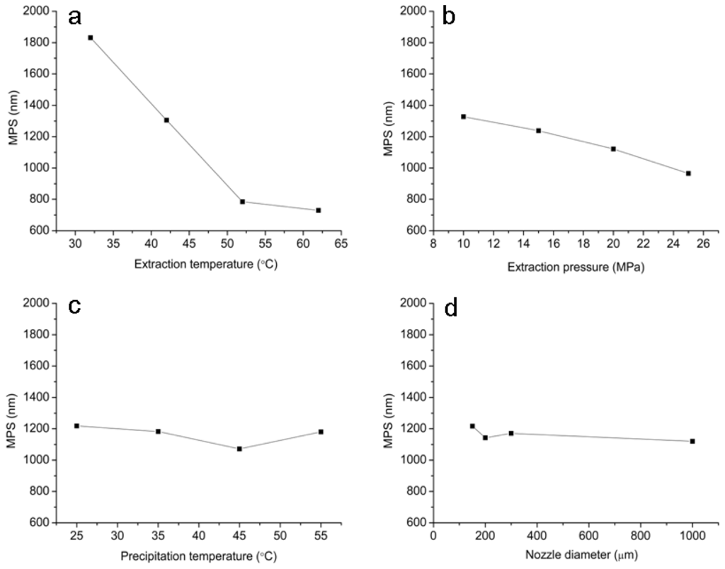 | Trial No. | Extraction Temperature (°C) | Extraction Pressure (MPa) | Precipitation Temperature (°C) | Nozzle Diameter (μm) | MPS (nm) |