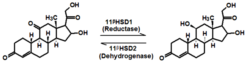 Glucocorticoids are a class of steroid hormones which bind to the glucocorticoid receptor. The glucocorticoids name was derived from their role in the regulation of glucose metabolism and from their synthesis. Glucocorticoids play an important role in the regulation of multiple physiological processes such as energy metabolism, maintenance of blood pressure, stress responses, and cognitive functions. The dysregulation of glucocorticoids has been implicated in the pathogenesis of diabetes and metabolic syndromes. The major glucocorticoid, cortisol, is normal in healthy individuals but the increased level in the intracellular adipose tissue could be responsible for “visceral obesity”. Cortisol is an important regulator of fuel metabolism during the starvation and stress which is modulated by 11β-hydroxysteroid dehydrogenase type 1 (11βHSD1) and 11β-hydroxysteroid dehydrogenase type 2 (11βHSD2). 11βHSD1, a NADP(H)+-dependent bidirectional enzyme, was highly expressed in the liver [1], adipose tissue [2] as well as found in a number of other tissues such as brain [3], blood vessels [4], macrophage [5], eye [6], bone [7], lung [8], and ovary [9]. 11βHSD1 regulates the access of glucocorticoid to steroid receptors by catalyzing the conversion of inactive cortisone into active cortisol. 11βHSD2 is a NAD+-dependent dehydrogenase which catalyzes the reverse reaction of 11βHSD1 (converts the active cortisol into inactive cortisone). 11βHSD2 is mainly localized in the mineralocorticoid receptor (MR), and target tissues like kidney, colon, and salivary gland where it functions to protect the MR from excessive exposure to cortisol.