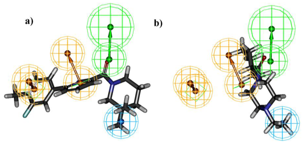 Best pharmacophore model Hypo1 aligned to training set compound (a) Active molecule compound 1 (IC50 0.1 nM); (b) Inactive molecule compound 18 (IC50 53000 nM). Pharmacophore features are color coded (Hy-Ali, hydrophobic aliphatic, blue; RA, ring aromatic, brown and HBA, hydrogen bond acceptor, green).