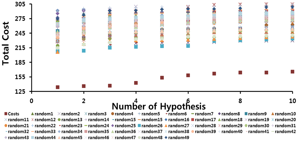Fischer’s test was applied to evaluate the statistical significance of Hypo1 based on statistical validation. In this method the experimental activity values of training set compounds were scrambled randomly and subsequently the scrambled datasets were used to generate the number of hypotheses depending on their significant levels. All the parameters were set as in the initial hypothesis generation. This validation was to check if there was any strong correlation between the structures and activity values. For this study, we selected the 98% confidence level; hence 49 random spreadsheets were produced by mixing up the experimental activity values present in the training set. By analyzing the resultant 49 hypotheses, Hypo1 was shown to be far superior to the 49 random pharmacophore models (Figure 5). This cross validation confirmed that there was a 98% chance of the pharmacophore model representing a true correlation in the training set activity data and thus gave us strong confidence in Hypo1.