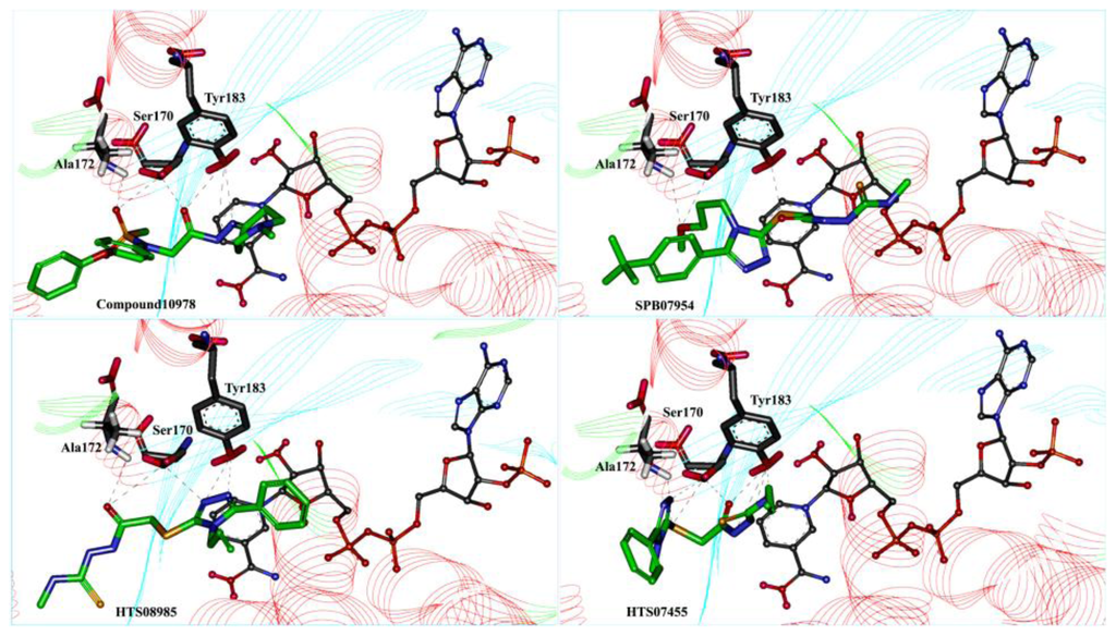 The orientation of hit molecules in the active site of 11βHSD1. Green color—leads and hydrogen bonds in black are shown.