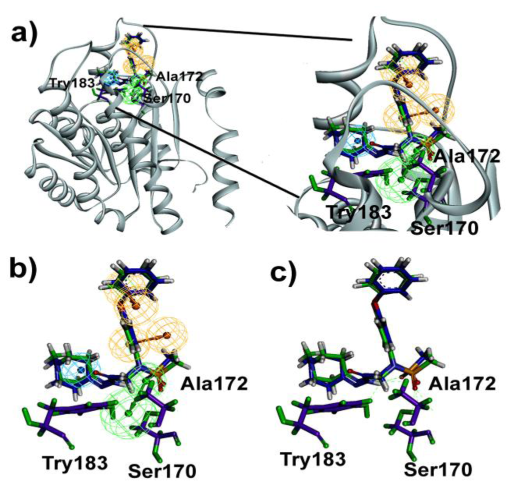 (a) Compound 10978 fit with Hypo1 was overlaid in the active site of 11βHSD1 crystal structure (PDB ID: 3REI) represented as ribbon; (b) overlay of compound 10978 with docked pose and geometric constraint of Hypo1; (c) overlay of compound 10978 with docked pose and geometric constraint of Hypo1 without the hypothesis. Pharmacophore features are color coded (Hy-Ali, hydrophobic aliphatic, blue; RA, ring aromatic, brown and HBA, hydrogen bond acceptor, green). Green color molecules represent the Hypo1 fit molecule and violet color represents the dock pose.