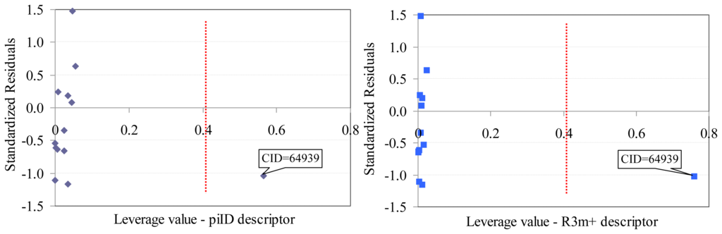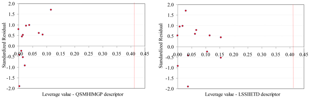 In order to assess the applicability domain of the obtained models, two approaches were involved on the full model with identified descriptors in the training sets [59]: leverage and identification of response outliers. A standardized measure of the distance between the descriptor values for the ith observation and the means of the descriptor-values for all observations was computed to identify the leverage in descriptors (leverage value, hi). Whenever hi > 3·(k + 1)/n (where k = number of independent variables in the model, n = sample size) compound was considered influential in the model [60] and was excluded from further analysis of the model. The response outliers were defined as compounds with absolute standardized residuals higher than 2.5. Leverage values (hi) vs. standardized residuals for compounds in training set was plotted to identify response outliers as well as independent variables with leverage values higher than threshold value (see Figures 2 and 3).