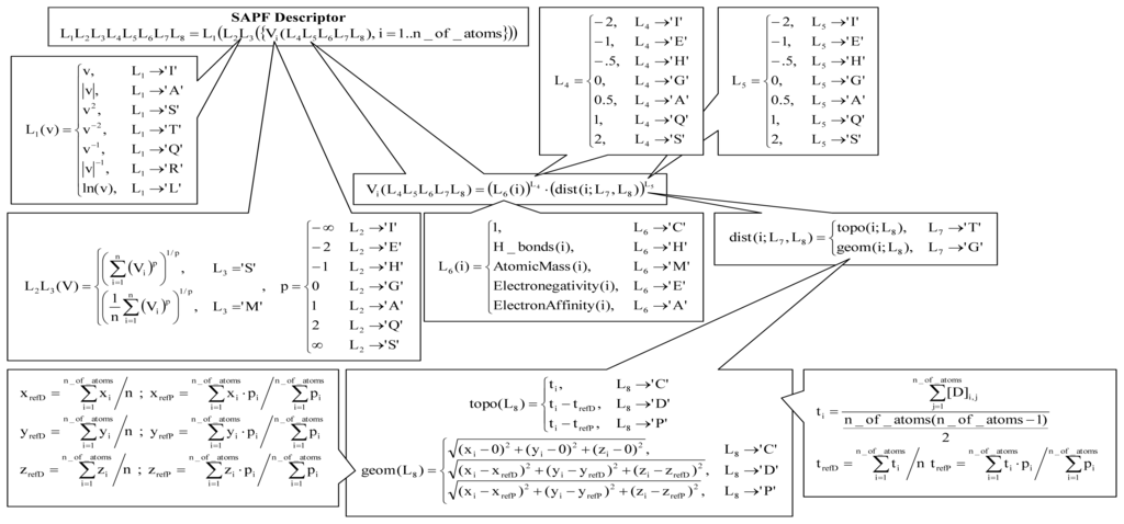 The molecular descriptors for the chemical compounds were calculated using a home-made software that implemented Structural Atomic Property Family [53,54] (SAPF approach, methodology of calculation depicted in Figure 6) and the Dragon software [55] (all Dragon descriptors).