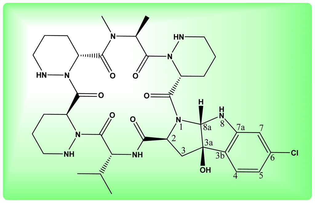 Agricultural antibiotic produced by different species of actinomyces is a biological product from a natural resource. Agricultural antibiotics have been attracting growing interest with the development of environmentally friendly and safe integrated crop management. In our ongoing screening for new bioactive microbial compounds, a novel hexapeptide antibiotic NW-G01 (Figure 1) was obtained by Streptomyces alboflavus 313 which is isolated from a soil sample collected from Shaanxi province of China. Absolute structure was determined using a combination of single crystal X-ray diffraction and Marfey’s method finally. The antibiotic incorporated one molecule of valine, N-methyl-alanine, chlorinated pyrroloindoline derivative, and three molecules of piperazic acids [1,2]. Interestingly, NW-G01 exhibited strong antibacterial activity against several species of gram-positive bacteria, such as Bacillus subtilis, Bacillus cereus, and Staphyloccocus aureus [3]. In addition, it had strong in vitro fungistatic activity against some plant pathogen, such as Sclerotinia sclerotiorum, Botrytis cinerea, Coniothyrium diplodiella and Exserohlum turcium [4]. These consequences imply that NW-G01 has the potential to be developed into anti-infection agents or agro-fungicides.