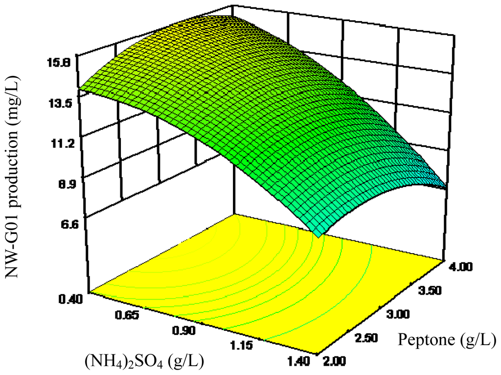 Response surface curve for NW-G01 production by Streptomyces alboflavus 313 as a function of (NH4)2SO4 and peptone concentrations, when CaCO3 concentration was maintained at 1.00 g/L.