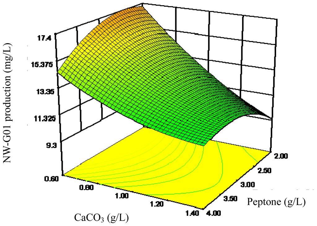 Response surface curve for NW-G01 production by Streptomyces alboflavus 313 as a function of peptone and CaCO3 concentrations, when (NH4)2SO4 concentration was maintained at 0.90 g/L.