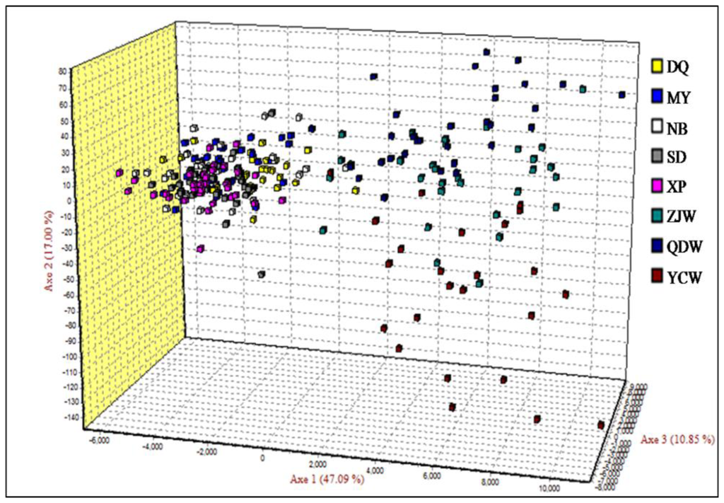 Three dimensional scatter plots for individuals of eight samples of the large yellow croaker based on factor correspondence analysis (FCA) analysis, in which each axis represents one principal factor.