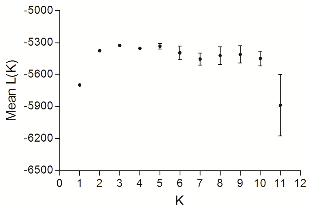 - Pritchard, J.K.; Stephens, M.; Donnelly, P. Inference of stock structure using multilocus genotype data. Genetics 2000, 155, 945–959. [Google Scholar]