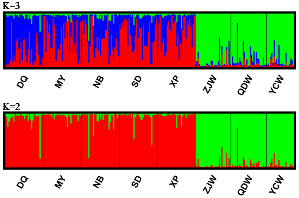 Results of structure analysis based on nine microsatellite loci. Each individual is represented by a vertical line, which is colored according to the assigned groups at estimated K = 3 (see Figure 2). Results of K = 2 are also presented for identifying the significant differentiation between cultures stocks and wild populations.