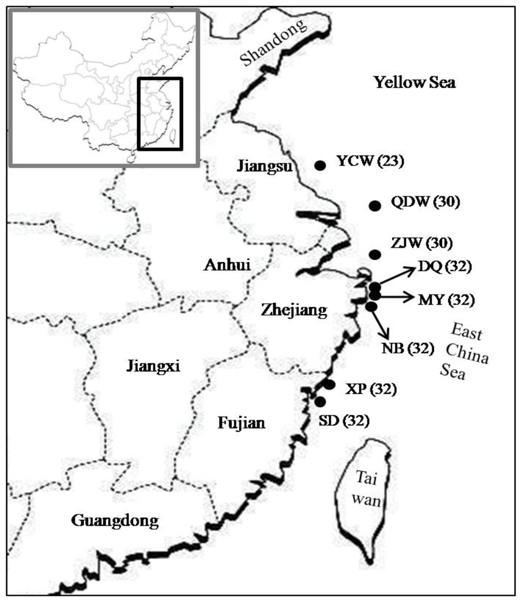 We analyzed five cultured stocks and three wild populations of the large yellow croaker. Among these five cultured stocks, three (DQ, MY and NB) were collected from Ningbo, Zhejiang province, while the other two (XP and SD) were from Ningde, Fujian province. In detail, two (MY and NB) and three stocks (DQ, SD and XP) were the third and second generation offspring of the local fish farms, respectively. The broodstocks of these cultured stocks were founded using brooders collected from the central East China Sea. Due to stock collapse in the wild resources of this croaker, however, it is very difficult to capture the wild fish. Fortunately, we collected three wild populations (ZJW, QDW and YCW) from the northern and central East China Sea during several fisheries surveys between 2007 and 2010. Judging from the body size, all the wild individuals were adult. Detailed information about sample size and location is shown in Figure 4. A small piece of muscle tissue or fin clip was collected and stored in 95% ethanol for DNA extraction.