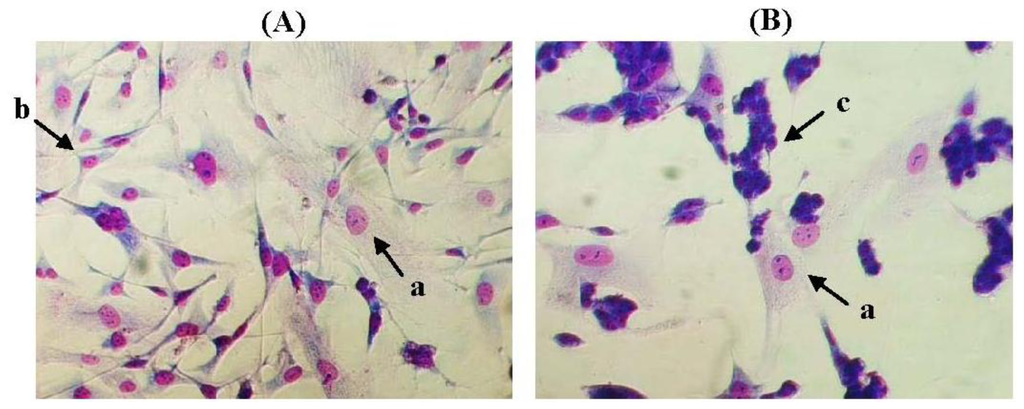 Co-culture of (A) MDA-MB-231 cells with MCF-10A cells, and (B) BT-474 cells with MCF-10A cells. The BT-474 cells can easily be distinguished from MCF-10A cells, whereas the epithelial-like morphology of MDA-MB-231 cells is not easily distinguishable. The pictures were taken at 40% cell confluence with 200× magnification, where 0.01 mm was equal to 10 μm. a: MCF-10A cells, b: MDA-MB-231 cells and c: BT-474 cells.
