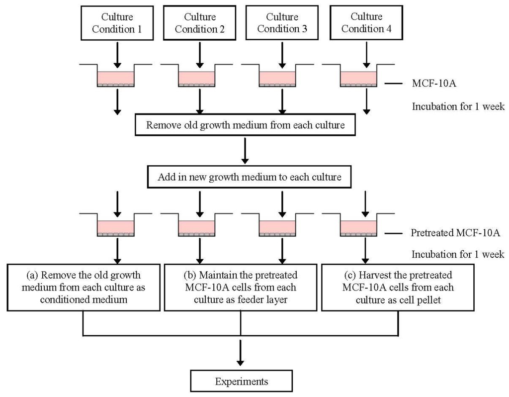 The conditioned media and MCF-10A cells preincubated with pioglitazone and/or serum-rich growth media were prepared by seeding 1.0 × 104 cells/mL of MCF-10A cells in T-75-cm2 cell culture flasks and the cells were maintained with low glucose DMEM growth medium, as described above, until the cells were 70–80% confluent. Next, the old growth medium was removed and the adherent MCF-10A feeder layer was carefully washed several times with prewarmed PBS before adding the appropriate concentration of pioglitazone and/or serum-rich supplemented growth media, as described in Table 2. The MCF-10A cultures were then incubated under the appropriate culture conditions for 1 week. After 1 week of incubation, the pioglitazone and/or serum-rich supplemented growth media were removed, and the preincubated MCF-10A feeder layer, for all culture conditions, was carefully washed again several times with prewarmed PBS before fresh growth media were added to the MCF-10A feeder layer. The preincubated MCF-10A feeder layer was then incubated with the fresh growth medium again for 1 week. Following a week of incubation, the growth media, which is now described as conditioned media, for all culture conditions was collected in 15 mL falcon tubes. The conditioned media was centrifuged at maximum speed for 20 min to concentrate any particles or cell debris, and the supernatants were collected and used for non-adhesive interaction study with BT-474 cells, as described in Section 4.5, or were used for immunoassay, as described in Section 4.6. The preincubated MCF-10A cells were also monitored using Hemacolor Quik staining and inverted microscopy, or harvested for soluble factor transcript expression study, as described in Section 4.7. In brief, the preparations of the conditioned media and preincubated MCF-10A cells are outlined in Figure 10.