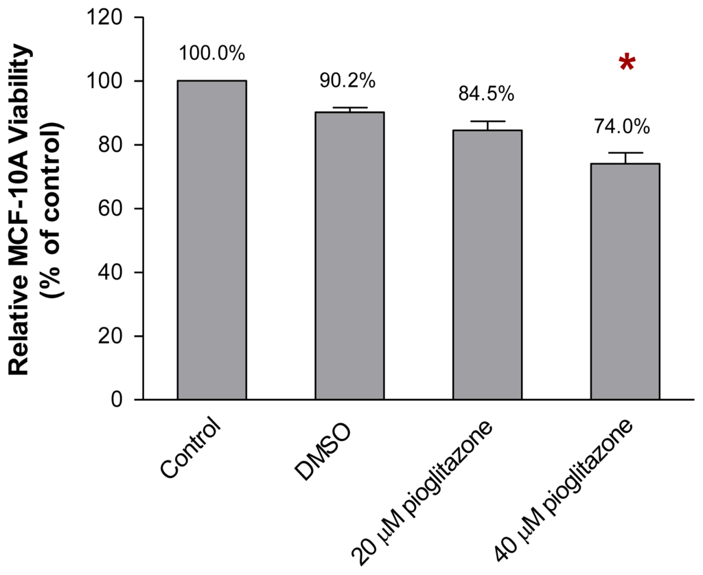 Viability of MCF-10A cells incubated with increasing concentrations of pioglitazone in the growth medium. One thousand cells were used as the input for incubation, and the incubation was carried out for 1 week. The values are expressed as mean ± SD from 3 replicates. * p < 0.05 was denoted as statistically significant.