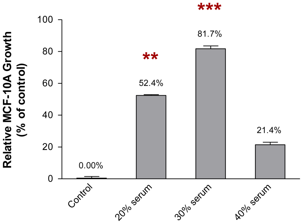 Growth of MCF-10A cells incubated with increasing concentrations of serum in the growth medium. One thousand cells were used as the input for incubation, and the incubation was carried out for 1 week. Each value was calculated as the % of incubated cells when compared to control cells. The values were expressed as mean ± SD from 3 replicates. ** p < 0.01 and *** p < 0.001 were denoted as statistically significant.