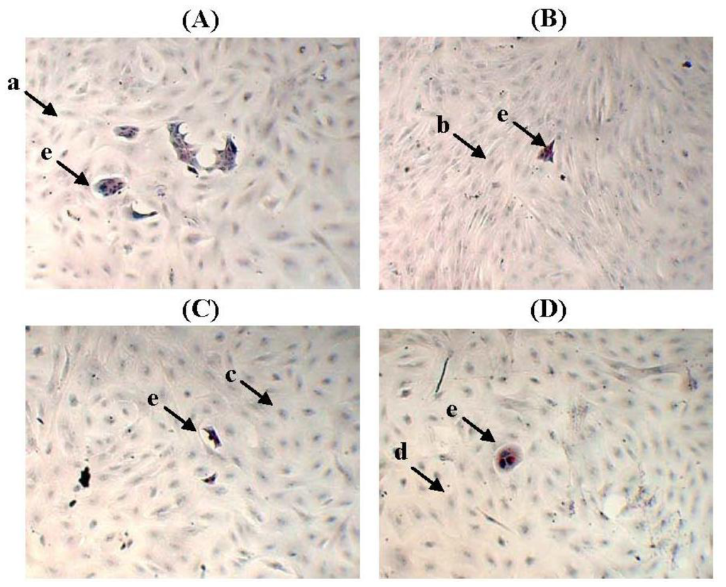 The morphologies of MCF-10A cells preincubated with (A) Culture Condition 1; (B) Culture Condition 2; (C) Culture Condition 3; and (D) Culture Condition 4. One hundred cells were used as the input for incubation, and the incubation was carried out for 1 week. The cells were stained with Oil Red O Staining. The pictures were taken with 200× magnification, where 0.01 mm was equal to 10 μm. Arrow a, b, c and d denote the MCF-10A cells preincubated with Culture Condition 1, 2, 3 and 4, respectively, whereas e denotes the BT-474 cells grown on the preincubated MCF-10A feeder layers.