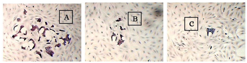 The BT-474 colonies on the feeder layer of MCF-10A cells preincubated with pioglitazone and/or serum-rich growth media. (A) Large BT-474 colonies in this study were denoted as a cell population of about 1–2 mm diameter on the preincubated MCF-10A feeder layer; (B) moderate BT-474 colonies were defined as a cell population of about 0.5 mm diameter on the preincubated MCF-10A feeder layer; and (C) small BT-474 colonies were defined as a cell population of less than 0.2 mm diameter on the preincubated MCF-10A feeder layer. The pictures were taken with 40× magnification, where 0.01 mm was equal to 10 μm.