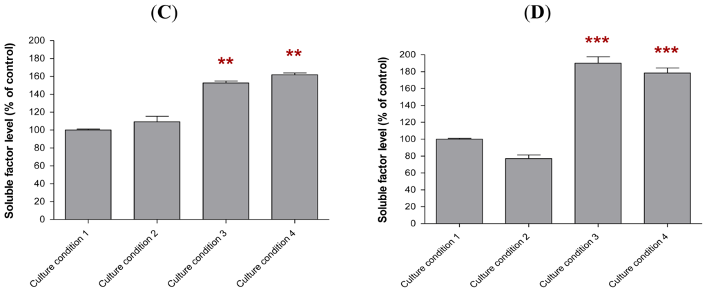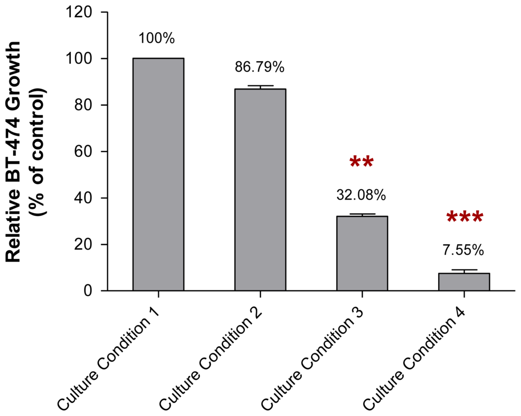 Growth of BT-474 cells incubated with the conditioned media of MCF-10A cells preincubated with Culture Condition 1, Culture Condition 2, Culture Condition 3 and Culture Condition 4. One hundred cells were used as the input for incubation, and the incubation was carried out for 2 weeks. Each value was calculated as the % of sample cells relative to the control cells. The values were expressed as mean ± SD from 3 replicates. ** p < 0.01 and *** p < 0.001 were denoted as statistically significant.