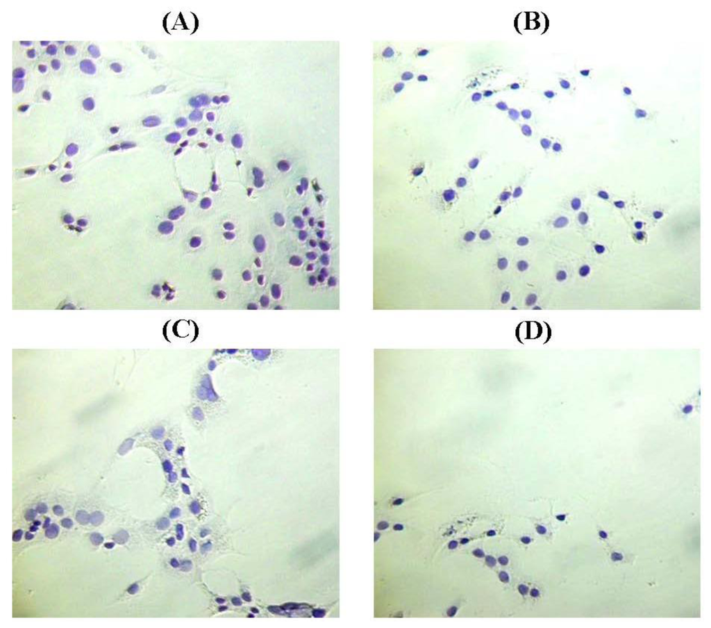 The morphologies of BT-474 cells preincubated with (A) Culture Condition 1; (B) Culture Condition 2; (C) Culture Condition 3; and (D) Culture Condition 4. One hundred cells were used as the input for incubation, and the incubation was carried out for 2 weeks. The cells were stained with Hemacolor Quick Staining. The pictures were taken with 200 × magnification, where 0.01 mm was equal to 10 μm.