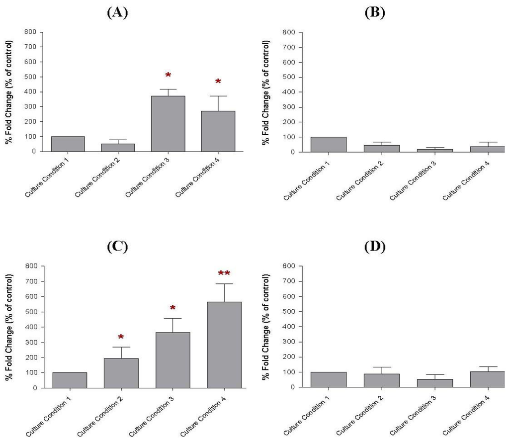 The transcript levels of (A) soluble factor a, (B) soluble factor b, (C) soluble factor c and (D) soluble factor d in MCF-10A cells preincubated with pioglitazone and/or serum-rich growth media. These genes’ transcripts were analysed using real-time PCR. Each value was calculated as a percentage of fold change in expression, in the preincubated MCF-10A cells. The gene transcript in the MCF-10A cells preincubated with Culture Condition 1 was defined as 100%. The values were expressed as mean ± SD from 3 replicates. * p < 0.05 and ** p < 0.01 were denoted as statistically significant.