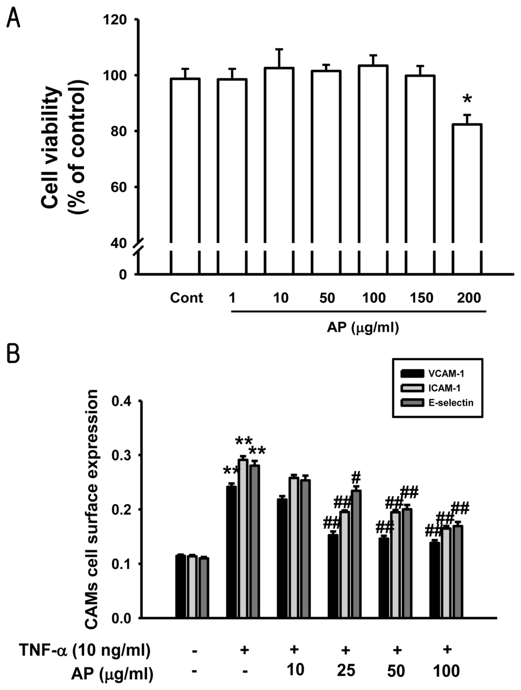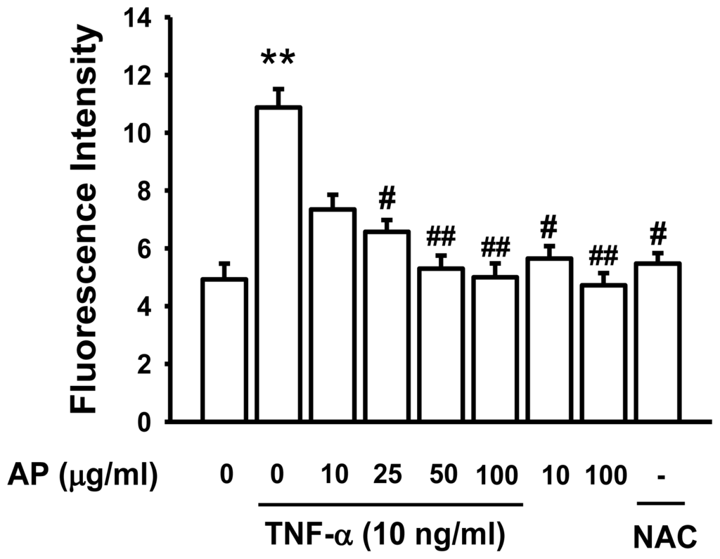 Effect of AP on TNF-α-induced ROS production. HUVECs were pretreated with AP (10–100 μg/mL) or NAC (50 μM) for 30 min and then stimulated with/without TNF-α (10 ng/mL) for 1 h. The fluorescence intensity of cells was measured using a fluorescence microplate. Values are expressed as a mean percentage of the fluorescence intensity ± S.E. of five individual experiments. ** p < 0.01 vs. control, # p < 0.05, ## p < 0.01 vs. TNF-α alone.