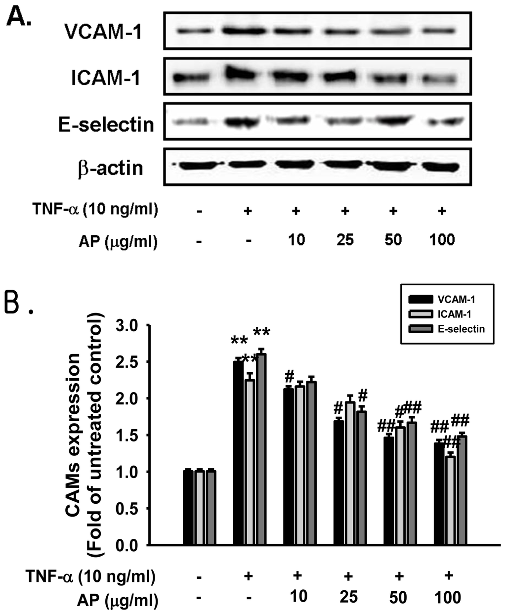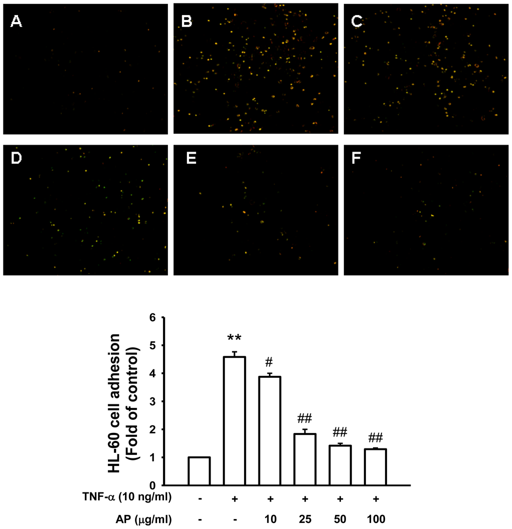 Effect of AP on TNF-α-induced adhesion of HL-60 cells to HUVEC. Adhesion of fluorescence-labeled HL-60 cells to HUVEC was determined as described in Materials and Methods. (a) Control; (b) TNF-α (10 ng/mL); (c) co-treated with TNF-α and AP (10 μg/mL); (d) co-treated with TNF-α and AP (25 μg/mL); (e) co-treated with TNF-α and AP (50 μg/mL); (f) co-treated with TNF-α and AP (100 μg/mL). The amounts of adherent HL-60 cells were monitored by fluorescence microscopy. Low panel represents ratio of fluorescence intensity. Values are expressed as mean ± S.E. of five independent experiments with triplicate dishes. ** p < 0.01 vs. control, # p < 0.05, ## p < 0.01 vs. TNF-α alone.