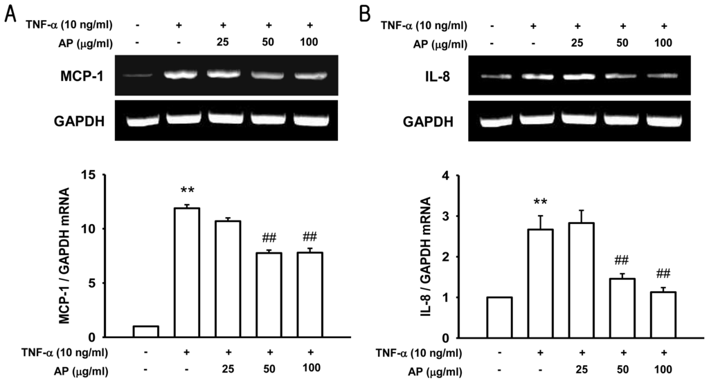 Effect of AP on TNF-α-induced increase of monocyte chemoattractant protein-1 (MCP-1) (a) and Interleukin-8 (IL-8) (b) mRNA expression. HUVEC were pretreated with AP and then stimulated with TNF-α. MCP-1 and IL-8 mRNA expression was determined by RT-PCR. Values are expressed as a fold of basal value and are the mean ± S.E. of five independent experiments. ** p < 0.01 vs. control, ## p < 0.01 vs. TNF-α alone.