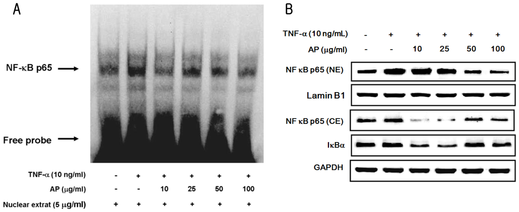 Effect of AP on TNF-α-induced NF-κB activation in HUVECs. Cells were preincubated with AP and treated with 10 ng/mL of TNF-α. (a) Nuclear protein extracts were prepared, and electrophoretic mobility shift assay (EMSA) was performed using the biotin-labeled double-stranded oligonucleotide containing consensus NF-κB binding sequences, as described in Materials and Methods; (b) Effect of AP on TNF-α-induced NF-κB p65 translocation into nucleus and IκBα degradation in HUVEC. Each electrophoretogram is representative of the results from three independent experiments.