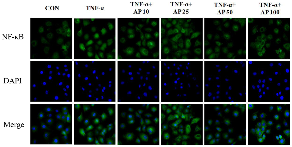 It has been also shown that activation of the transcription factor NF-κB by TNF-α is required for the transcriptional activation of endothelial cell adhesion molecules [29]. Nuclear factor κB (NF-κB) has been implicated in the transcriptional activation of numerous genes, including those relevant to atherogenesis and inflammatory responses [30,31]. NF-κB is found in an inactive form in the cytoplasm and appears associated with its inhibitor molecule (I-κB). On stimulation, rapid phosphorylation and degradation of IκBα allows NF-κB to translocate into the nucleus and regulate transcription of the target genes. In cultured human and bovine vascular endothelial cells, p50/p65 heterodimers of NF-κB appear to play a major role in cytokine-dependent transcription of E-selectin, ICAM-1, and VCAM-1 genes [32]. Furthermore, activation of NF-κB occurs in the vascular endothelium covering atherosclerotic lesions in humans [33]. To study the effect of AP on NF-κB activation in TNF-α-induced HUVEC, electrophoretic mobility shift assay (EMSA) was performed. As shown in Figure 5a, stimulation with TNF-α increased the level of NF-κB-DNA-binding activity. This finding was caused by significant retardation in the mobility of the labeled oligonucleotide. In contrast, AP markedly inhibited the NF-κB-DNA-binding activity in the nuclear extract from TNF-α-induced HUVECs. These results therefore, showed that AP inhibits the TNF-α-induced NF-κB activation. Using western blot analysis, NF-κB p65 protein was expressed abundantly in cytoplasm but less in the nucleus of unstimulated cells. However, translocation of NF-κB p65 from the cytoplasm to the nucleus was significantly increased in TNF-α-stimulated cells. TNF-α-dependent translocation of NF-κB p65 to the nucleus was markedly suppressed by pretreatment with AP. In contrast, NF-κB p65 protein in the cytosolic extract significantly increased following treatment with AP. Thus, AP inhibited the TNF-α-induced increase of NF-κB p65 expression levels. Pretreatment with AP inhibited IκBα degradation in a dose dependent manner. Upon induction with TNF-α, the intensity of IκBα was significantly reduced. In contrast, pretreatment of cells with AP significantly inhibited the degradation of IκBα in TNF-α-induced HUVECs (Figure 5b). This was further confirmed by fluorescence microscopy showing that while cells are in a quiescent state, NF-κB p65 protein was mainly located in cytoplasm and only a few cells showed a strongly positive nuclear stain, whereas TNF-α profoundly increased the number of nuclei for the p65 NF-κB. However, AP-treated cells represented the diminished staining level of nuclear p65 in a dose dependent manner (Figure 6).
